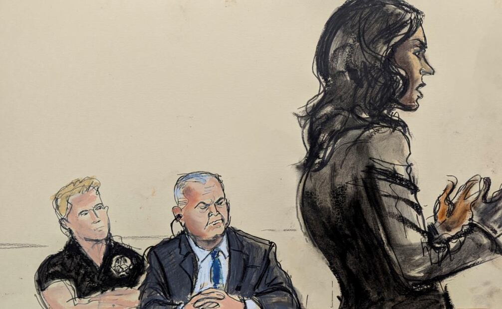 La fiscal adjunta de Estados Unidos, Saritha Komatireddy, a la derecha, da la declaración de sentencia del gobierno mientras Genaro García Luna, en el centro, observa en la corte federal de Brooklyn, el miércoles 16 de octubre de 2024, en Nueva York.