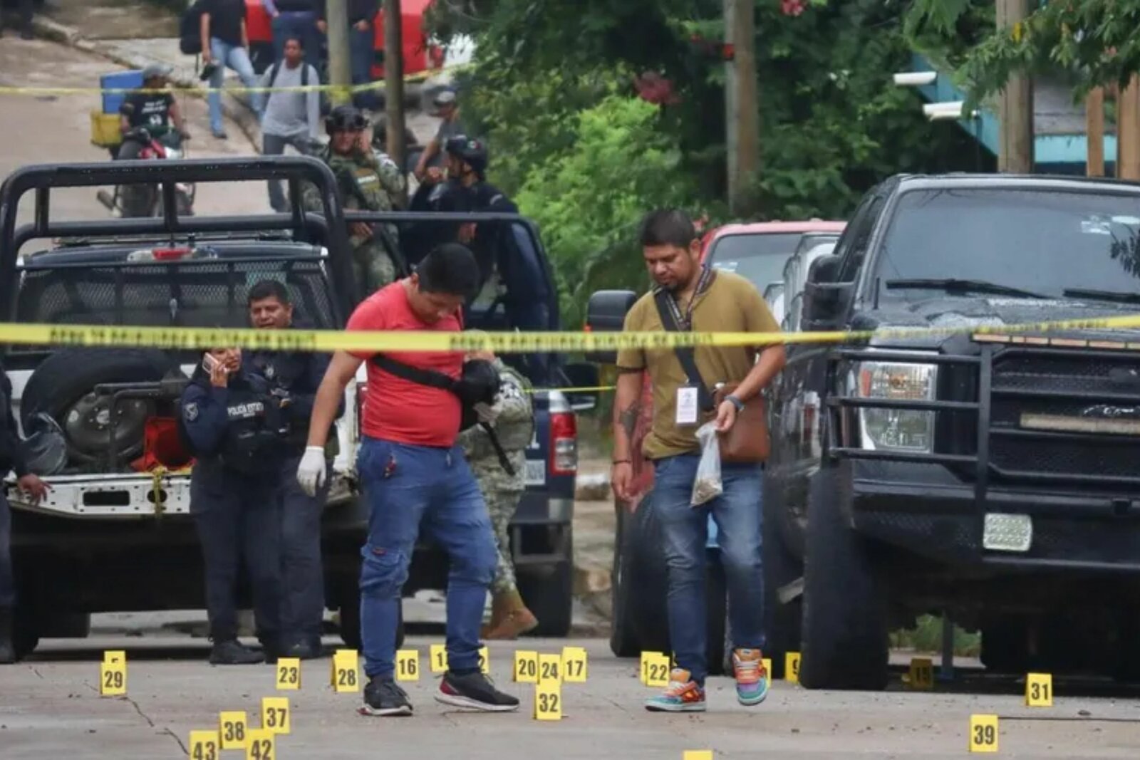 El personal de la Fiscalía General del Estado (FGE) llegó al lugar para realizar las diligencias correspondientes, asegurando y contabilizando los casquillos percutidos que quedaron en la escena del crimen. Se confirmó que la vivienda recibió más de cincuenta impactos de bala.