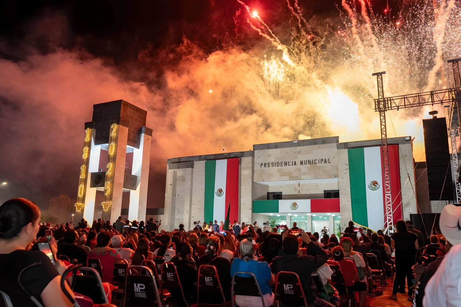 Una vez concluido el acto cívico desde la Presidencia Municipal, la fiesta continuó con un espectáculo visual que capturó la atención de todos los presentes. Primero se realizó un moderno y coordinado show de drones, que formaron figuras alusivas a la cultura mexicana y símbolos patrios en el cielo. Posteriormente, un espectáculo de pirotecnia iluminó la noche con fuegos artificiales multicolores que fueron recibidos con ovaciones por parte del público. El evento musical principal fue protagonizado por el grupo “Los Rojos”, quienes ofrecieron un concierto lleno de energía y éxitos conocidos. La agrupación norteña logró conectar con los asistentes, quienes cantaron y bailaron al ritmo de sus canciones en una plaza abarrotada. El ambiente fue de alegría y convivencia durante toda su presentación.La seguridad del evento fue una de las prioridades del gobierno municipal. Se implementó un amplio operativo de vigilancia, que incluyó revisión en los accesos a la Macroplaza para garantizar que la celebración se desarrollara sin contratiempos. Autoridades locales confirmaron que el evento transcurrió sin incidentes, destacando la colaboración y el comportamiento ordenado de la ciudadanía.Esta primera celebración del Grito de Independencia bajo la actual administración se caracterizó por su enfoque familiar, la promoción de la cultura local y el cuidado de la seguridad pública. Con una gran participación ciudadana y un ambiente lleno de alegría.