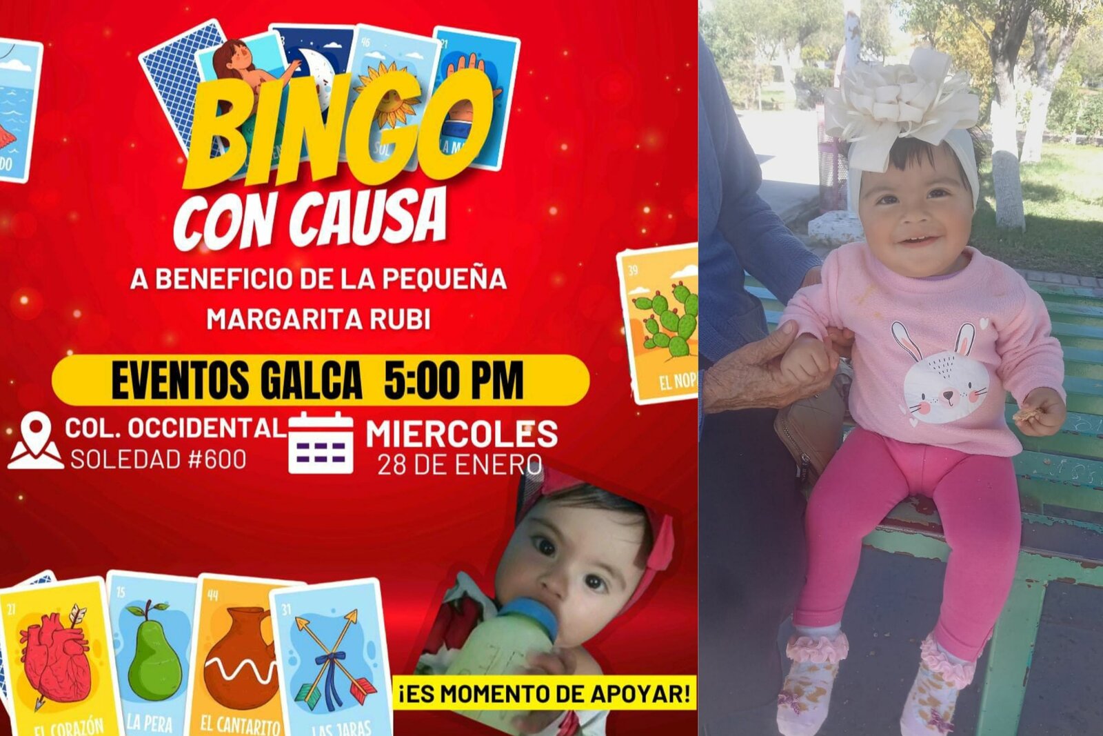 Un bingo con causa se llevará a cabo el miércoles 28 de enero en el salón de eventos Galga, ubicado en la calle Soledad número 600, colonia Occidental, para apoyar a Margarita, la bebé de 1 año y 2 meses que sufrió quemaduras en aproximadamente el 45 % de su cuerpo tras un accidente doméstico en una olla de frijoles hirviendo en Ciudad Frontera el pasado 7 de enero.