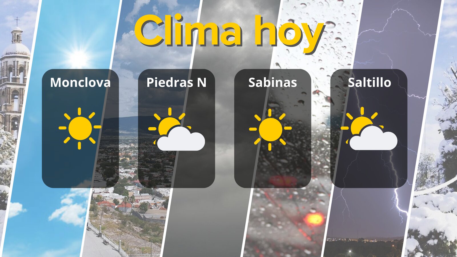 Por su parte, Piedras Negras tendrá 33° / 20°, alternando nubes y claros, mientras que Saltillo mantiene un rango de 28° / 13°, con brisas suaves de 13 a 37 km/h del sur.