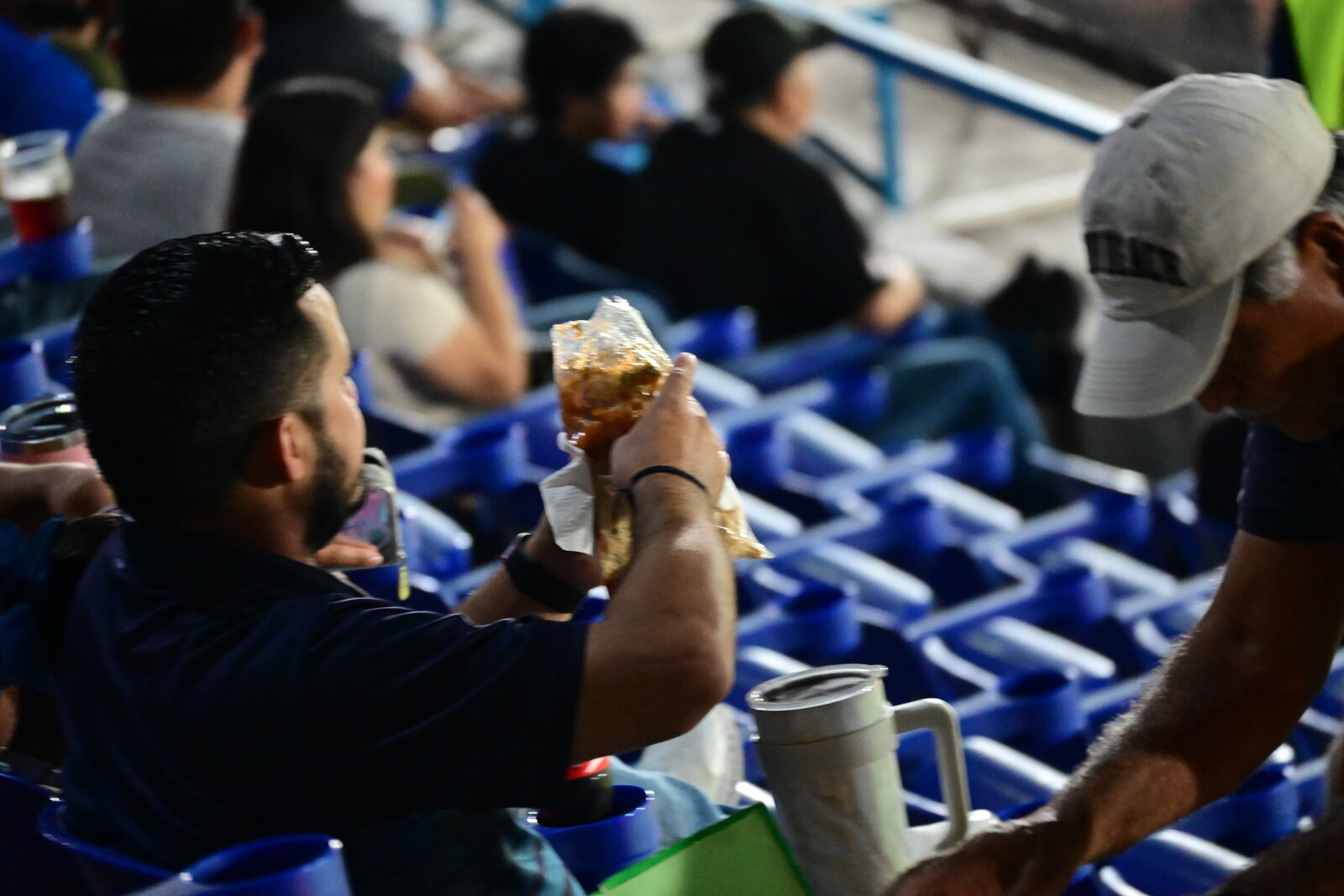 Los puestos de comida se convierten en puntos de encuentro. Familias completas, grupos de amigos y aficionados solitarios coinciden en la fila, eligiendo entre lo clásico o lo inmediato. El refresco frío acompaña la mayoría de las elecciones, mientras que algunas bebidas más tradicionales del ambiente deportivo aparecen como complemento natural del momento.