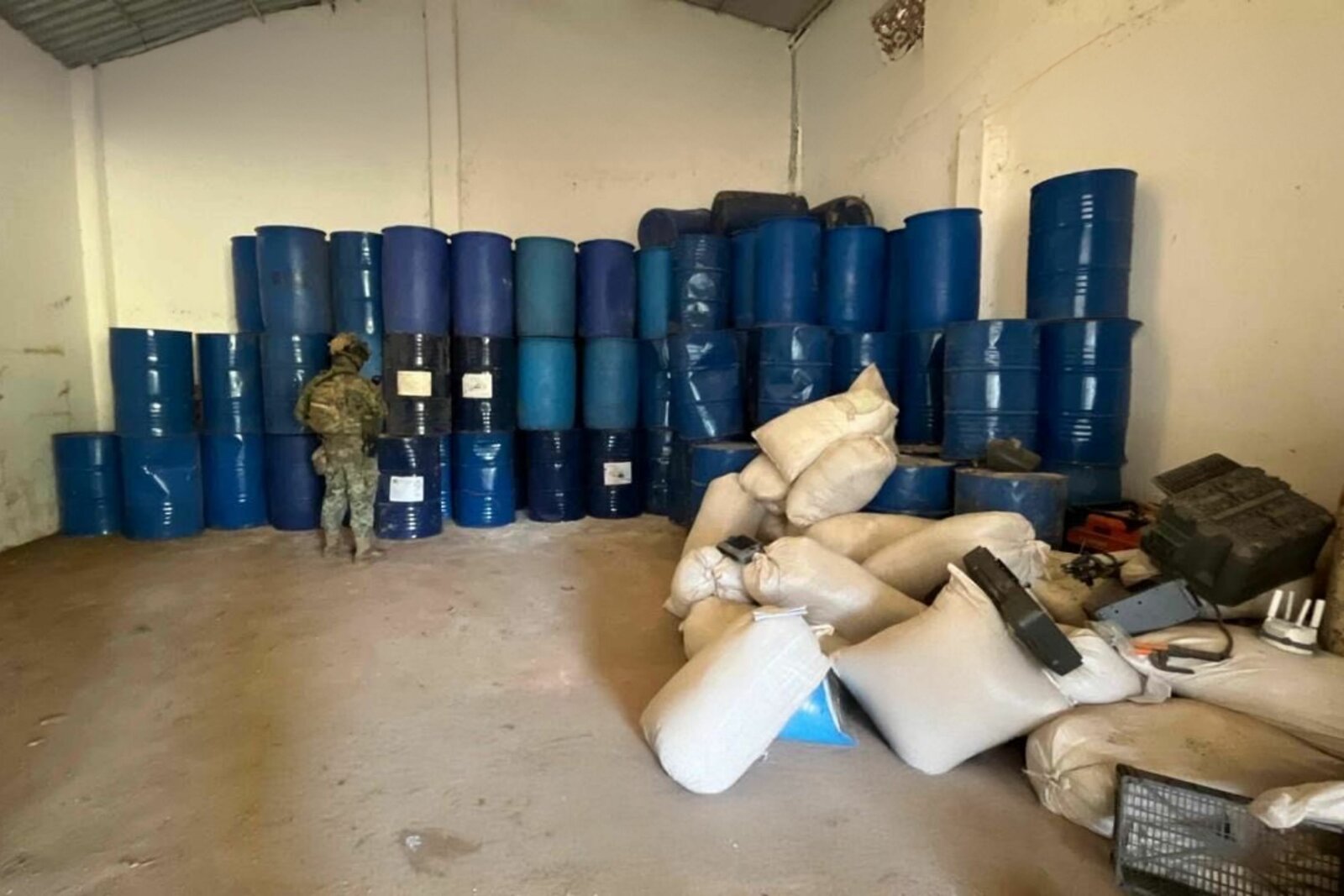 Durante los recorridos terrestres, las fuerzas federales ubicaron una bodega con precursores químicos y un campamento clandestino presuntamente empleado para la producción de estupefacientes. En el sitio se aseguraron e inhabilitaron aproximadamente 24 mil 920 litros y más de 12 mil 200 kilogramos de sustancias químicas, catalogadas como de alto riesgo para la salud pública. Información oficial señala que el laboratorio tenía la capacidad de producir de manera simultánea metanfetaminas, tusi y opioides sintéticos, una característica poco común en este tipo de instalaciones clandestinas.