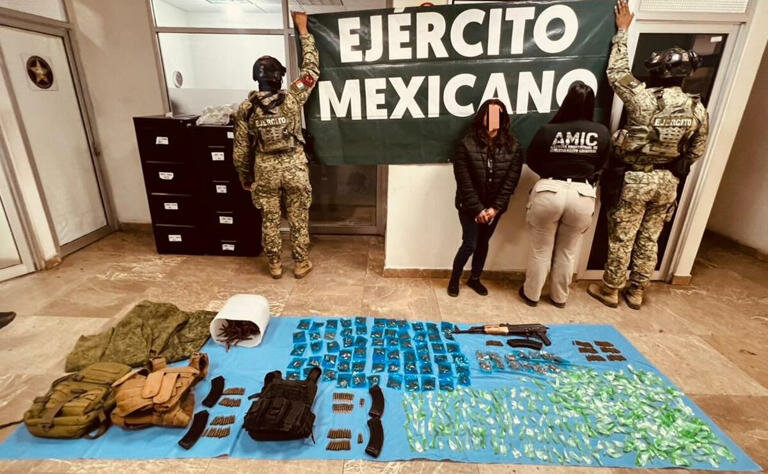 El Ejército y la AMIC detuvieron a una mujer armada en Ciudad Obregón, asegurando fusil, drogas, chalecos tácticos y vehículos en un operativo conjunto.