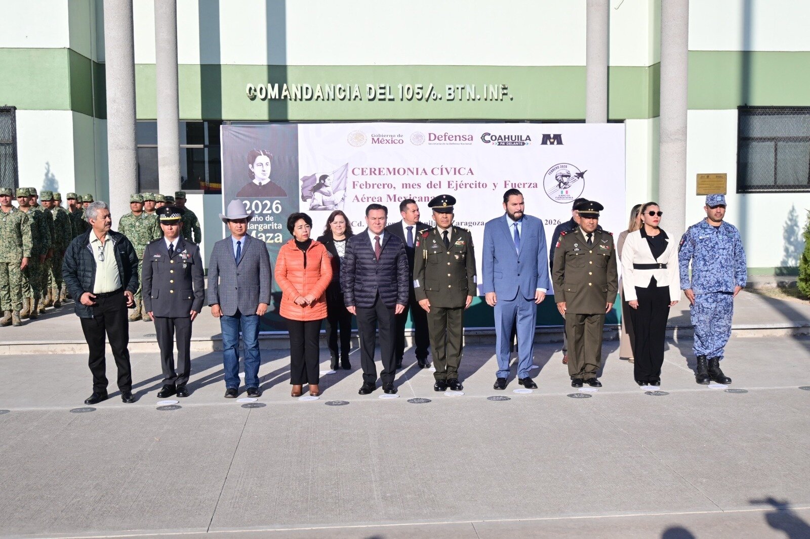 En su mensaje, el general Juan Carlos Quiroz Muñoz destacó que hablar del Ejército y la Fuerza Aérea Mexicanos es hablar de Coahuila, al subrayar que en esta entidad se gestaron las raíces del Ejército Constitucionalista bajo la visión de Venustiano Carranza, originario de este estado, concretamente de Cuatro Ciénegas. Recordó que fue en 1913 cuando Carranza impulsó la organización de un ejército moderno, disciplinado y leal a la Constitución, sentando las bases del actual Ejército Mexicano. Asimismo, señaló que el 5 de febrero de 1915 se expidió el decreto que dio origen al arma de aviación militar, antecedente directo de la actual Fuerza Aérea Mexicana.