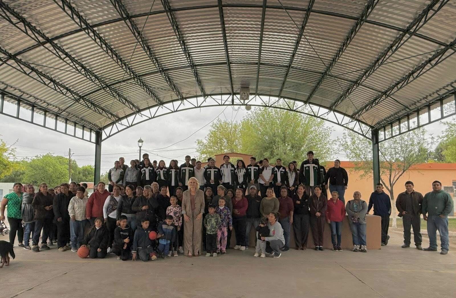 La alcaldesa Laura Jiménez Gutiérrez entregó una techumbre en la plaza principal de Minas La Florida, en Múzquiz, para mejorar espacios comunitarios y proteger a la población del clima.