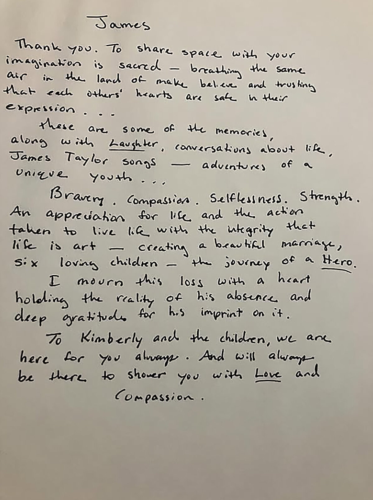 "Formé algunas palabras con un gran corazón. Esto es mucho para procesar. Estoy muy agradecida de haber compartido un pedazo del viaje de James. Él es amado. Kimberly te amamos y estaremos siempre aquí para ti y tus hermosos hijos", se lee en el mensaje que acompaña la carta, en la que se lee un mensaje en el describe a James con cuatro palabras: Valentía. Compasión. Generosidad. Fuerza.