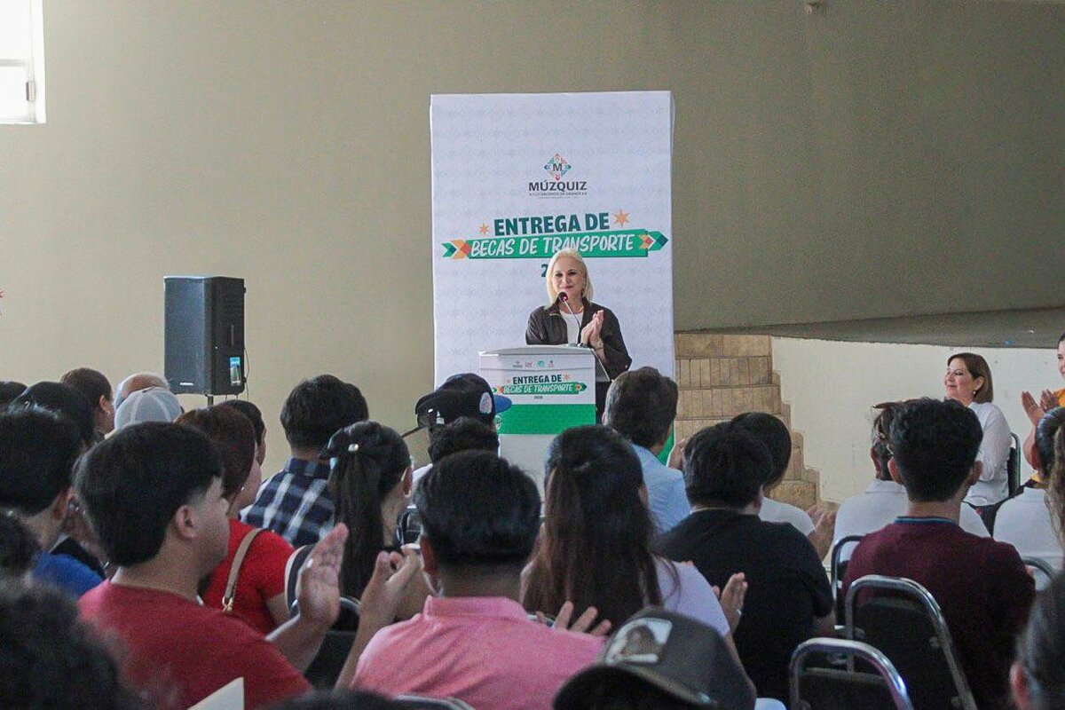 La alcaldesa Laura Jiménez Gutiérrez encabezó la entrega de 252 Becas de Transporte en Múzquiz, Coahuila, destinadas a estudiantes de nivel medio superior y superior de la Región Carbonífera, con el objetivo de reducir la deserción escolar por causas económicas durante el semestre 2026.