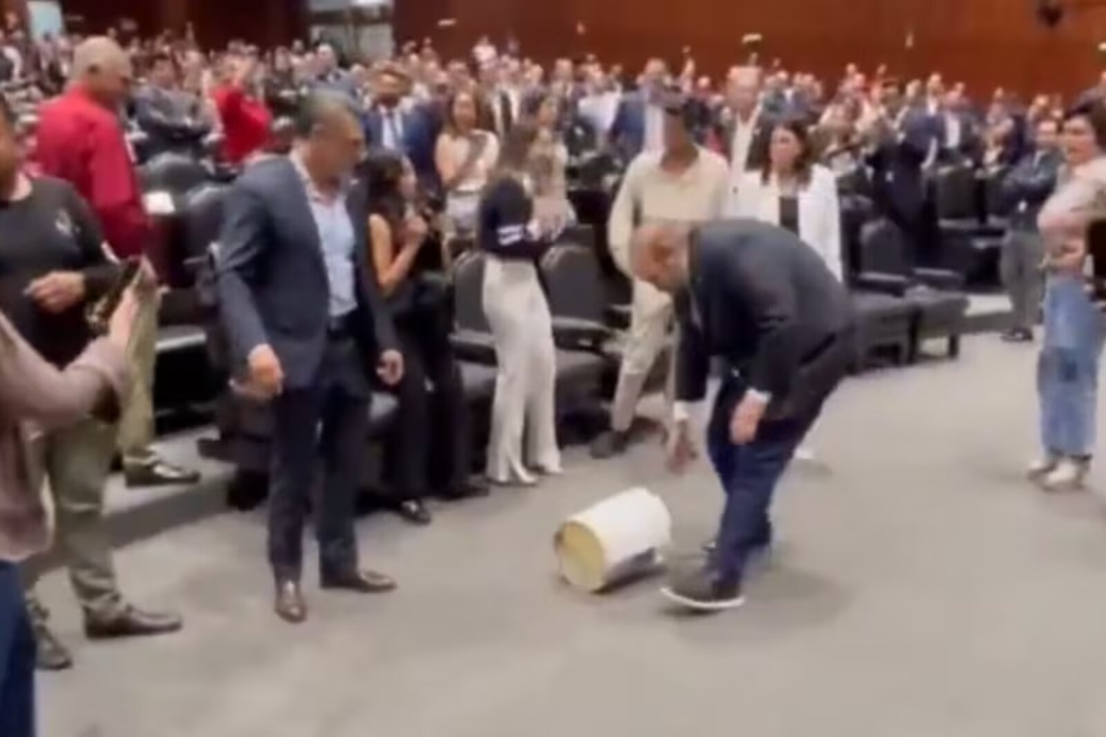Riña en San Lázaro: lanzan cubeta con chapopote en debate electoral